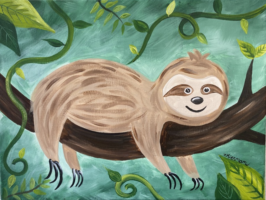 In diesem Workshop malen wir gemeinsam ein fröhliches Faultier im Dschungel, Schritt für Schritt auf Leinwand.